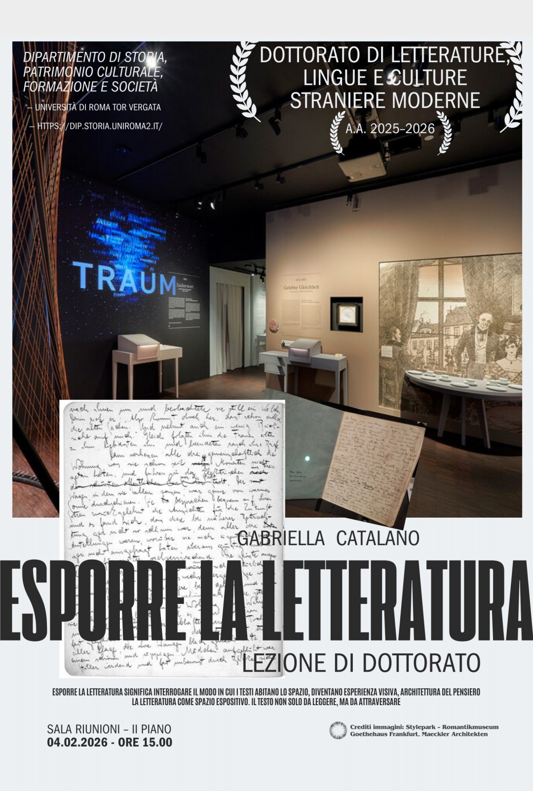 4 febbraio - Lezione Prof.ssa Gabriella Catalano 16/01/2026 4 febbraio 2026 15:00-17:00 Aula dipartimentale 2° piano Per il ciclo di lezioni "Lavori in corso": Gabriella Catalano (Università di Roma Tor Vergata), Esporre la letteratura