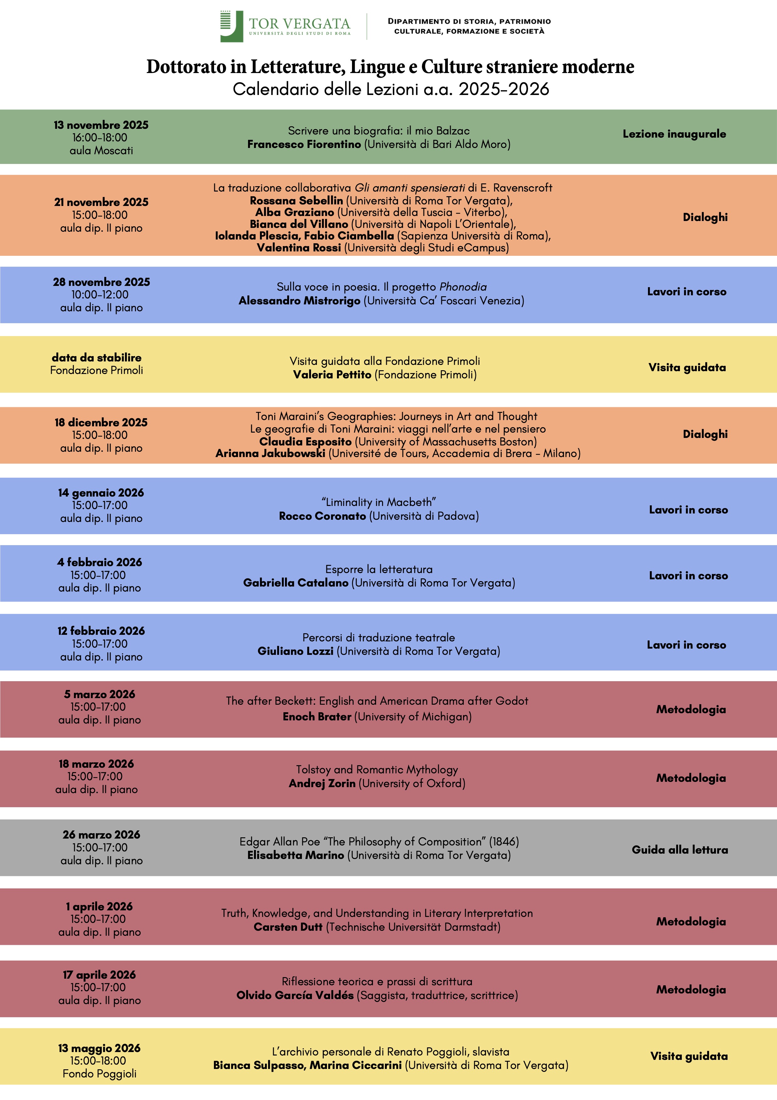 L’OFFERTA DIDATTICA propone un percorso formativo completo e integrato, capace di preparare le dottorande e i dottorandi ad affrontare la propria ricerca nella consapevolezza della varietà degli approcci critici. Ogni lezione/ seminario sarà innanzitutto esemplificativo di un metodo di indagine che, a partire dai riferimenti metodologici necessari e dalla conoscenza della tradizione di studi nel proprio ambito di conoscenza, ogni dottorando/ dottoranda potrà poi elaborare all’interno del proprio ambito disciplinare.