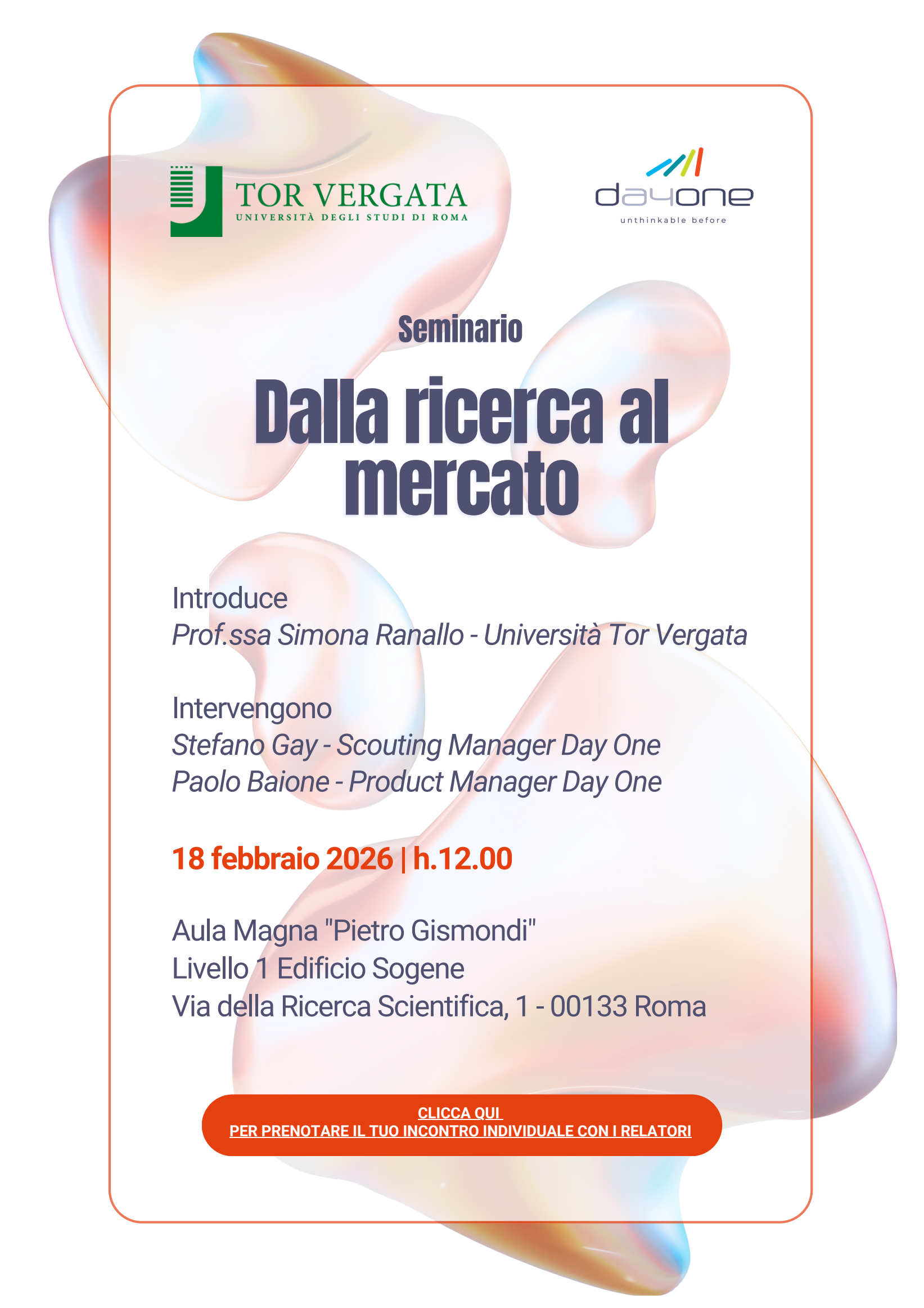 Dalla Ricerca al Mercato 18/02/2026 Dalla ricerca al mercato Introduce Prof.ssa Simona Ranallo - Università Tor Vergata Intervengono Stefano Gay - Scouting Manager Day One Paolo Baione - Product Manager Day One visualizza il file allegato