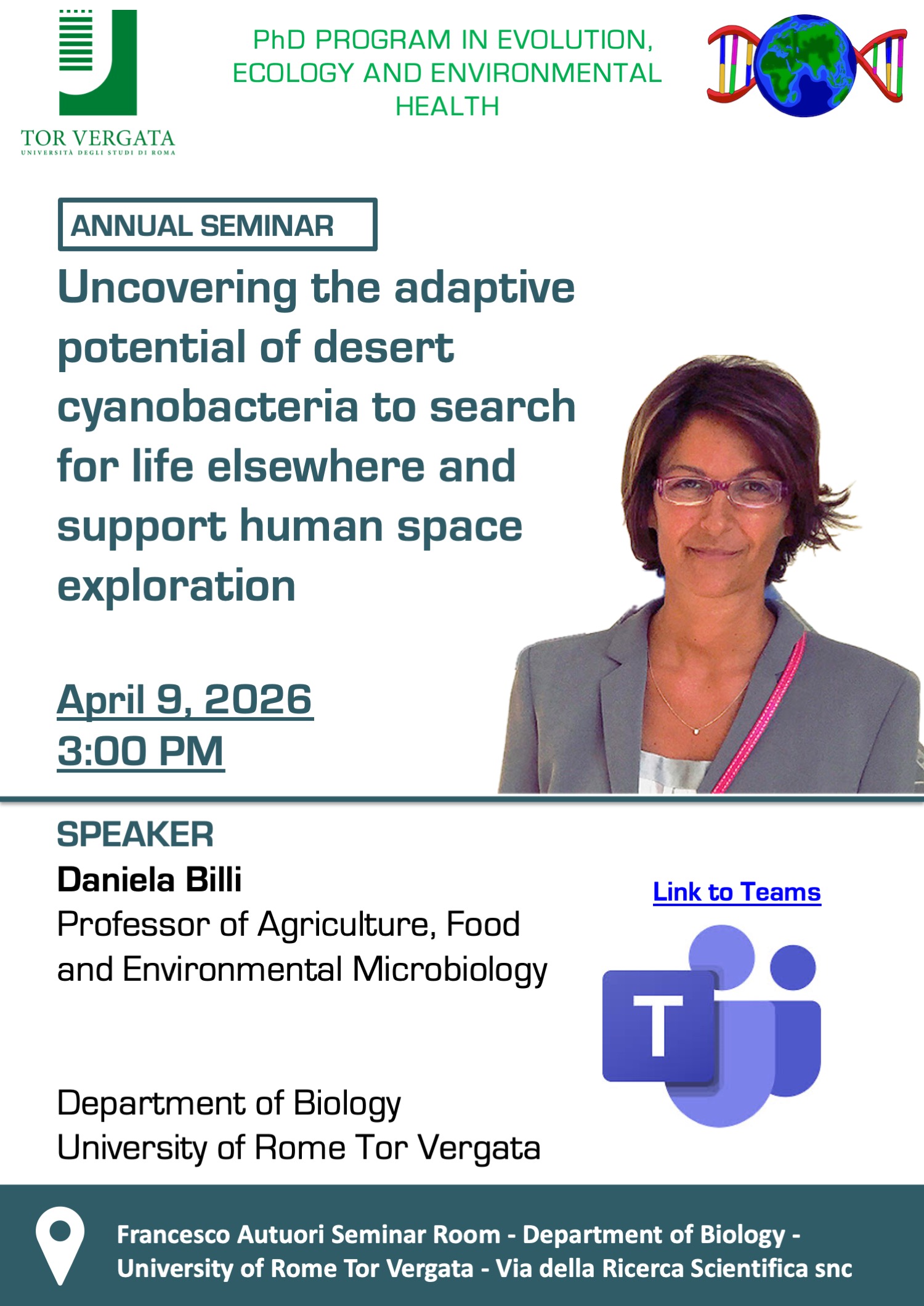 Uncovering the adaptive potential of desert cyanobacteria to search for life elsewhere and support human space exploration Prof.ssa Daniela Billi (University of Rome Tor Vergata) 9 Aprile, 2026